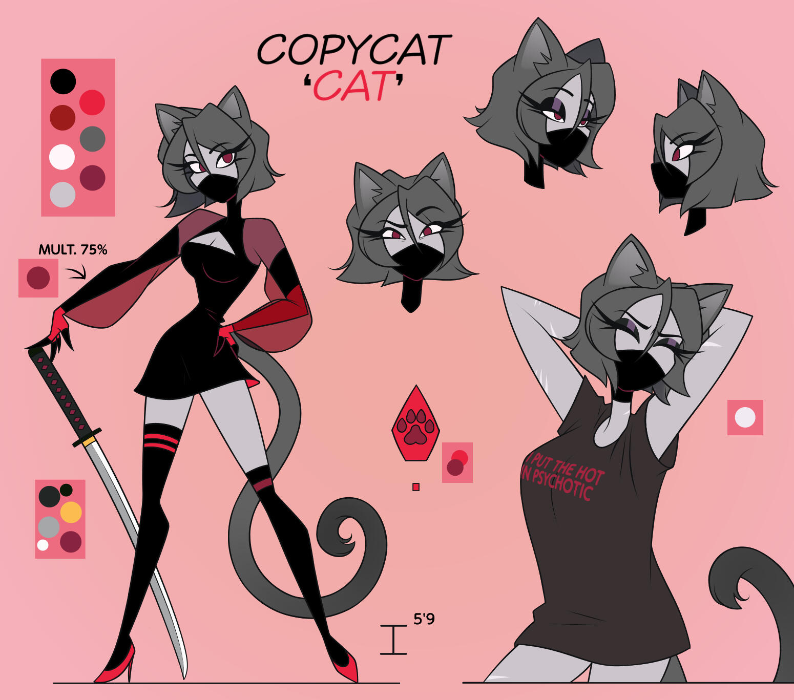 Copycat is a feline shapeshifting demon who is known for being loyal to the RADIO DEMON, though no one is sure on the specifics of why or for how long, as that is a secret kept between those two alone. Thanks to their bond, Cat now works as the lazy cat in charge of security for the hotel.This is a character who carries a plethora of secrets and, due to the heavy static filter placed over her voice, is left to communicate through limited facial expressions and body language, though some sounds are capable of spilling through the static which can be quite handy in some cases.