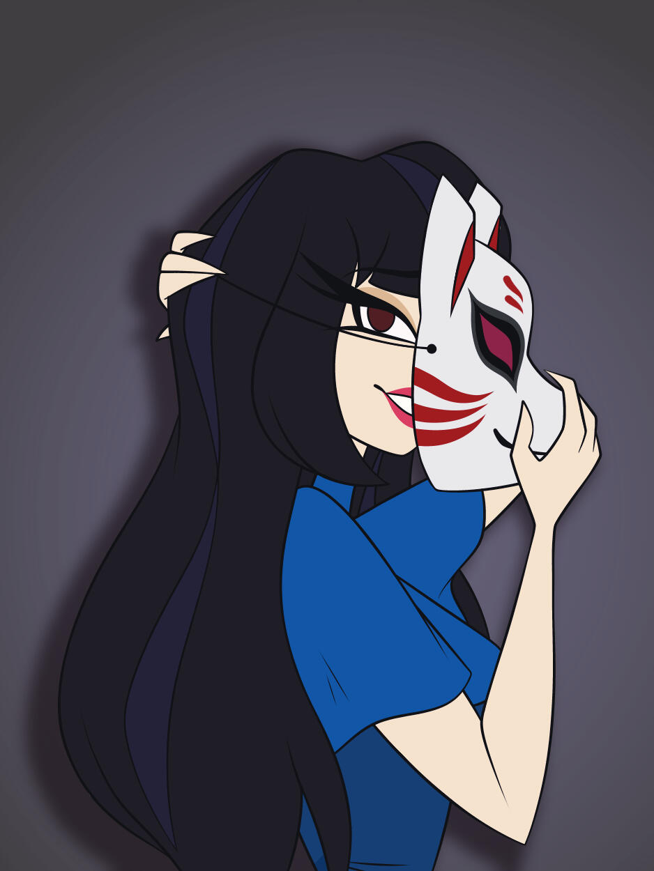 Mask only ever comes off when alone with Alastor or someone she equally trusts. Same goes for her allowing her ears and tail to be seen. Keeping them hidden with her shapeshifting ability helps her feel at ease.